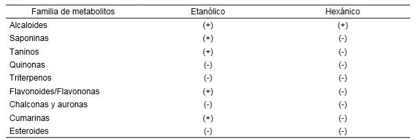 De acuerdo con el tamizaje fitoquímico, se determinó la presencia de las siguientes familias de metabolitos secundarios, en el extracto etanólico: alcaloides, saponinas, taninos, flavonoides/flavonas y cumarinas. En el extracto hexánico sólo fueron encontrados alcaloides. Los resultados para cada extracto se muestran en la tabla 1.