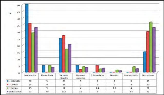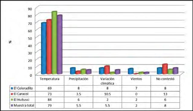Los pobladores han observado cambios en cuatro aspectos relacionados con el clima: temperatura, precipitación, variación climática y vientos. Sin embargo, la temperatura es la variable más observada en las tres comunidades y representa 79% de la muestra total (figura 3).