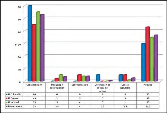 Las causas que generan el CC se agruparon en cinco aspectos: contaminación, incendios y deforestación, sobrepoblación, destrucción de la capa de ozono y causas naturales. Solamente 2.5% sitúa el origen del problema en causas naturales, mientras que la mayoría señaló causas antropogénicas. La mayoría sitúa el origen del CC en la contaminación (figura 5), esta apreciación coincide en las tres comunidades.