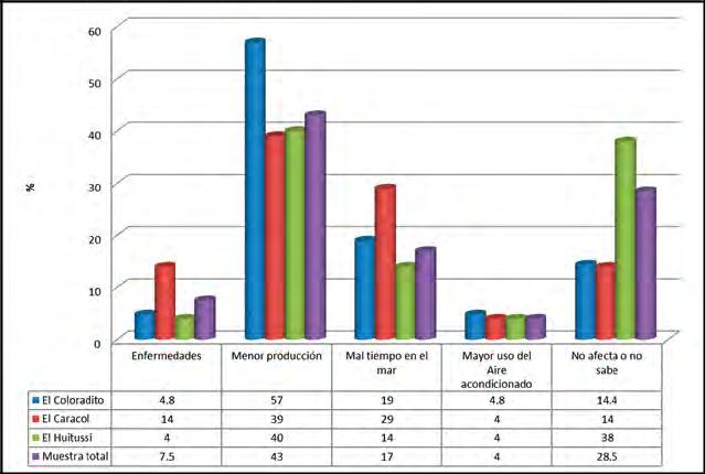 Los pobladores identificaron cuatro aspectos generales por medio de los cuales el CC tiene algún impacto negativo en sus medios de vida: enfermedades, menor producción, mal tiempo en el mar y mayor uso de aire acondicionado. Las respuestas más señaladas se muestran en la figura 6.