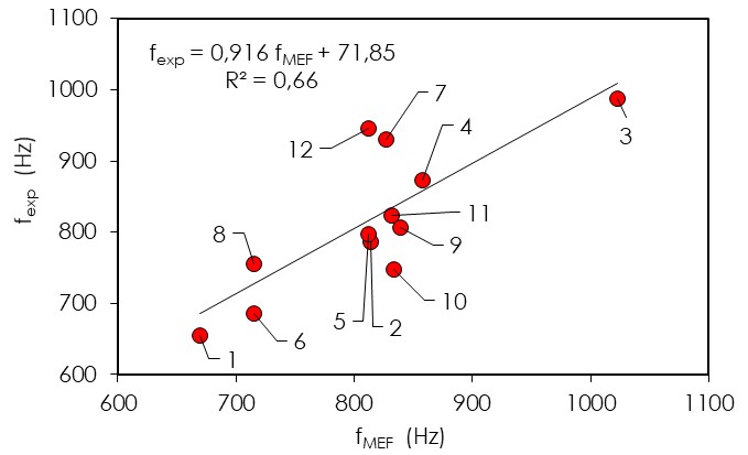 Como consecuencia, los resultados numéricos que utilizan estos datos como parámetros materiales en el modelo resultan en una variación correspondiente y/o similar. Este resultado se explica en la figura 5 que presenta la correlación de la frecuencia experimental (fexp) en función de la frecuencia numérica (fMEF), con un coeficiente de determinación aceptable, pero menor (R2 = 0.66).