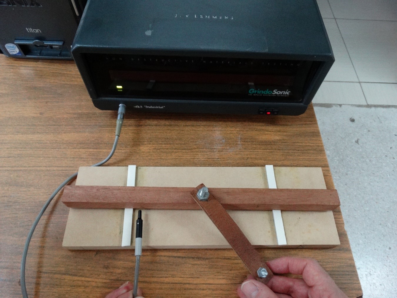 La determinación experimental del módulo dinámico siguió el procedimiento reportado por Villaseñor-Aguilar y Sotomayor-Castellanos (2015). Las pruebas de vibraciones transversales consistieron en medir la frecuencia natural de vibración perpendicular a la dirección longitudinal de la probeta. A este parámetro se le define como frecuencia experimental (fexp). Con tal propósito se utilizó un analizador de frecuencias Grindosonic® MK7 (Rango: 20 kHz - 100 kHz). La figura 1 muestra una fotografía de las pruebas de vibraciones transversales. El impulso elástico inicial fue aplicado en el centro geométrico de la cara superior de la probeta, en la dirección transversal a la misma, apoyada sobre dos soportes rígidos de tipo simple a una distancia nodal de 0.224 l. El ensayo dinámico en cada probeta fue repetido tres veces y el promedio de valores fue considerado para su análisis posterior.