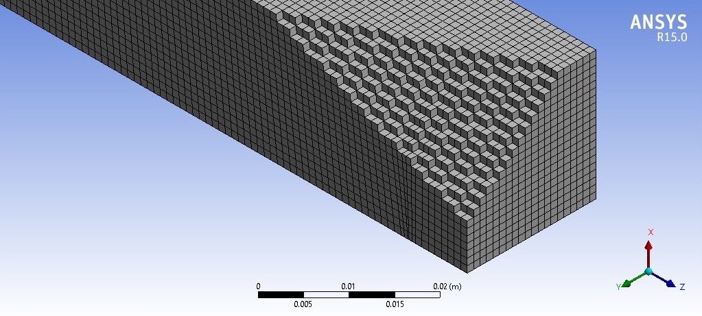 El cálculo por el método del elemento finito (MEF) siguió el procedimiento reportado por Soto-mayor-Castellanos y López-Garza (2016). El modelado consideró los aspectos siguientes: El programa utilizado para el análisis numérico fue ANSYS® 15. Se realizó un estudio de convergencia de la malla. Se modeló la probeta como una viga compuesta de un material isotrópico. Los valores de la densidad (ρCH) y el modulo dinámico experimental (Eexp) empleados corresponden a los resultados experimentales presentados en la tabla 1. El coeficiente de Poisson fue 0.3, valor sugerido por Sotomayor-Castellanos y López-Garza (2016). Los principales parámetros que se utilizaron en el MEF fueron geometría 3D; Tipo de elemento: Hexaédrico SOLID186; Tamaño de malla: 0,002 (m); Número de elementos; 116700: Número de nodos: 77495 (figura 2); y Función de forma: lineal.