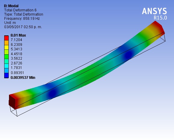 La tabla 1 presenta los resultados de la densidad, del módulo dinámico, de la frecuencia experimental y de la frecuencia numérica de las especies en estudio. La figura 3 presenta la deformación de una probeta de Cedrelaodorata en el primer modo de vibración. El contenido de humedad de la madera promedio fue de 10.8% con un coeficiente de variación de 1.1%. Este parámetro se consideró constante y sin influencia en los resultados.