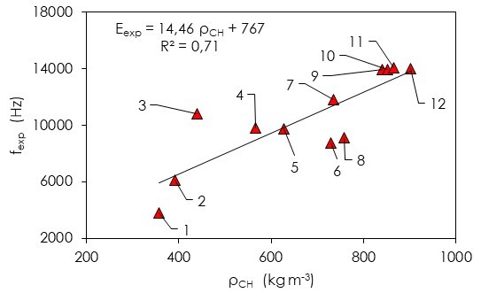 En efecto, el coeficiente de determinación de la regresión fexp = f(ρCH) es R2 = 0.71, valor aceptable de acuerdo con el paradigma vigente para ciencias y tecnología de la madera, el cual considera a la densidad como predictor de sus características elásticas, en este caso, del módulo dinámico (Niklas & Spatz, 2010). Sin embargo, no se observa una correspondencia inequívoca entre módulo dinámico y densidad de la madera, ambos experimentales.