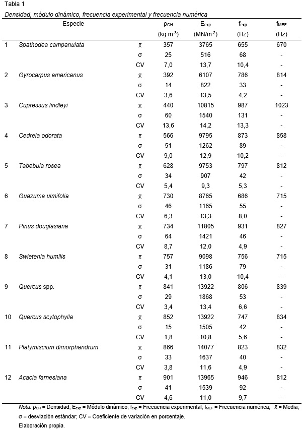 Las magnitudes de la densidad cubrieron un intervalo de 544 kg m-3, con un mínimo para Spathodea campanulata de 357 kg m-3 y un máximo para Acacia farnesiana de 901 kg m-3. Los valores del módulo dinámico experimental comprendieron un intervalo de 10312 MN m-2, con un mínimo de 3765 MN m-2 para S. campanulata y un máximo de 14077 MN m-2 para Platymiscium dimorphandrum. Asimismo, los valores de la frecuencia experimental cubrieron un rango de 291 Hz, con un mínimo para S. campanulata de 655 Hz, y un máximo de 987 Hz para Cupressus lindleyi.