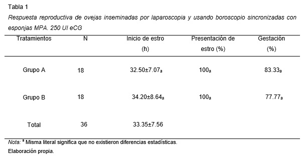 El tiempo promedio del inicio de estro fue de 33.35 ± 7.56 h después del retiro de las esponjas sin diferencias (P >0.05) entre grupos. Los valores promedio del inicio del estro fueron 32.50 ± 7.07 y 34.20 ± 8.64 h para los grupos A y B, respectivamente. Estos datos son similares a lo reportado por González-Reyna, Lucero-Magaña, Briones-Encinia, Limas-Martínez y Martínez-González (2014), quienes registraron inicios de estro de 28.6 a 34.6 h después del retiro de las esponjas. La totalidad de las ovejas presentaron estro después del tratamiento con esponjas sin encontrar diferencias (P >0.05) (tabla 1). Estos datos coinciden con lo reportado por Martínez-Tinajero et al. (2007), donde señalan que las ovejas sincronizadas con MAP + eCG presentan iguales resultados (100%).