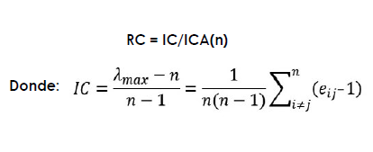 siendo eij = aij wj/wi y el ICA es el índice de consistencia medio obtenido al simular aleatoriamente los juicios para las matrices recíprocas de orden n.