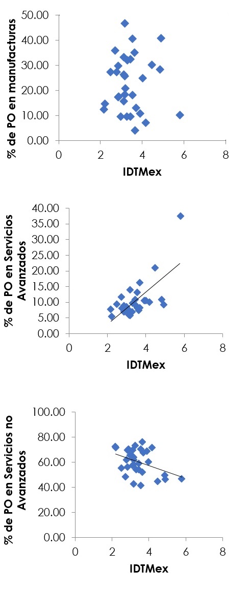 ponen en acción como parte de su quehacer específico. A falta de estudios de trayectorias formativas y laborales que confirmen y dimensionen esta relación entre competencias digitales y trabajo de servicios avanzados, nuestra propuesta consiste en comparar las curvas de regresión (ajustes por mínimos cuadrados) entre la colección de datos del IDT Mex por estado y la participación de manufactura, servicios y servicios avanzados en la población ocupada total en cada estado, en búsqueda de consistencias entre las variables en lugar de causalidades. Los resultados gráficos se muestran a continuación en la figura 3 y señalan lo siguiente acerca del nivel de apropiación social de las TIC:
