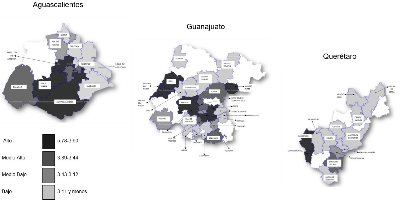 Los tres estados contiguos son bastante disímbolos en su extensión territorial. El mayor es Guanajuato con 30,600 km2 y sigue el estado de Querétaro con 11,600 km2, mientras que Aguascalientes abarca tan solo 5,615 km2 (INEGI, 2015). En cuanto al tamaño de su economía, medida a través del PIB per cápita, se encuentra en primer lugar Querétaro, quien es sexto lugar nacional, con $234,980; en segundo lugar Aguascalientes con $214,212, octavo lugar nacional y en la última posición Guanajuato, con $154,745, 17 a nivel nacional, debajo de la media nacional.