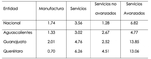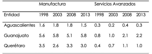 En suma, el sendero de la terciarización avanzada es compartido por los tres estados, aunque con una velocidad notoriamente menor en Aguascalientes y con mayor dinamismo en Querétaro. Llama la atención que a pesar del crecimiento de IED en el sector de manufacturas, únicamente en Guanajuato se registre un dinamismo del producto manufacturero superior al nacional. Si observamos la participación de cada sector dentro de sus respectivos estados, el patrón evolutivo es semejante: baja la manufactura, si bien se mantiene como el sector dominante; suben los servicios avanzados aunque son los de menor peso, y los servicios tradicionales prácticamente mantienen su peso. Esas son las características generales del cambio estructural en los tres estados.