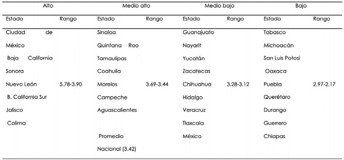 En línea con el planteamiento central de este trabajo, consistente en visibilizar las tendencias de cambio estructural articuladas en digitalización y terciarización a nivel regional, cabe apuntar que el índice previo muestra una relación positiva con el sector de servicios avanzados, el de mayor importancia en términos de productividad y de habilidades de trabajo basado en tecnologías digitales. En otras palabras, en México la configuración regional de la brecha digital muestra una relación con el peso de los servicios avanzados en los empleos locales. Por ello, la distribución de los estados que se muestra en la tabla 3 es coincidente en sus posiciones extremas con el peso y el desarrollo socioeconómico de las entidades involucradas (Ciudad de México en un caso, Chiapas y en el otro), pero en el espacio medio es importante tener en cuenta que si bien hay estados de relevancia por su crecimiento reciente, también son relativamente débiles en materia de sociedad de la información.