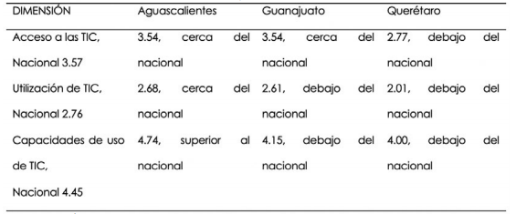 Como se ha mencionado, el susodicho índice está compuesto a su vez por tres dimensiones: acceso, utilización y capacidades, por lo cual es necesario mostrar esta composición para lanzar una mirada de mayor capacidad explicativa sobre las características de la digitalización regional en el Bajío. Ello tiene lugar en la tabla 4, el cual señala el dato de cada componente para cada estado, agregando un comentario sobre el sitio que ocupa cada estado en una lista nacional. Como puede verse, esta desagregación del IDT Mex para cada estado confirma que Aguascalientes sobresale de los otros dos estados y Querétaro tiene bajo desempeño en las tres dimensiones.
