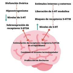 Diversos estudios han demostrado el efecto regulador de los estrógenos sobre la serotonina (5HT); estos aumentan la síntesis de 5HT, aumentan el número de receptores de 5-HT2A y disminuyen el número de receptores de 5-HT1B (Risco, 2010). Durante el climaterio se produce una pérdida de la función ovárica folicular, conocida como hipoestrogenismo, lo que lleva a la disminución de los niveles de serotonina con sobreexpresión de los receptores 5-HT2A (Sócrates et al., 2013).