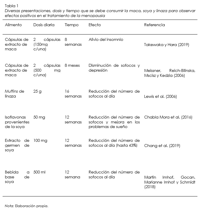 En esta revisión se describieron las recomendaciones dietéticas del consumo de maca, soya y linaza y sus efectos sobre la sintomatología menopáusica.