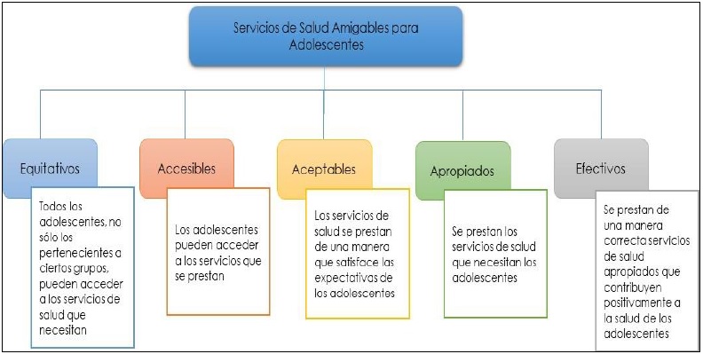 Sin embargo, a pesar de las múltiples necesidades de salud de esta población, los adolescentes tienen menor probabilidad de utilizar servicios de salud, comparados con personas de otras edades (Mejía-Gómez et al., 2010). Con la finalidad de acercar los servicios de salud a los adolescentes se desarrollan e implementan diferentes estrategias, como los denominados servicios de salud amigables para adolescentes (SSAA) propuestos por la OMS (2011). En 2014, esta organización emitió los estándares de calidad para los SSAA (Moreno-López, 2014), con el objetivo de contribuir al diseño de políticas y a una mejor planeación de los servicios de salud y, de esta forma, los adolescentes puedan obtener servicios de salud que respondan a sus necesidades (Moreno-López, 2014; OMS, 2011) (figura 1).