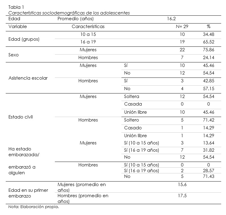 Se realizaron 29 entrevistas a adolescentes usuarios de las 11 clínicas con SSAA seleccionadas; 76% fueron mujeres; la edad promedio fue de 16 años; 55% de las mujeres y 71% de los hombres declararon ser solteros; 45% de las mujeres reportó haber estado embarazada alguna vez y 29% de los hombres reportó haber embarazado a su pareja (tabla 1).