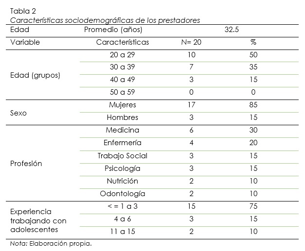 Se llevaron a cabo 20 entrevistas al personal de salud; 85% fueron mujeres, la edad promedio fue 32.5 años, 30% eran médicas/os, 20% enfermeras/os, 15% psicólogas/os y trabajadoras/es sociales y 10% odontólogas/os y nutriólogas/os (tabla 2).