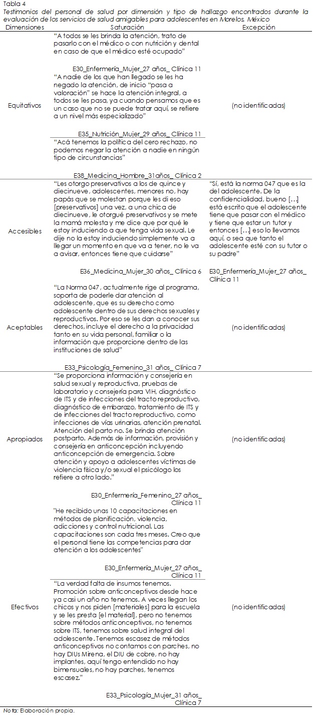 Equidad-Discursivamente equitativos desde la perspectiva de los adolescentes y del personal de salud. Adolescentes y personal de salud manifiestan sistemáticamente no identificar restricciones en la oferta de los SSAA. Se percibe que en las unidades de salud se da atención a todos los adolescentes (T-E08 y T-E38). En esta dimensión no se identificaron testimonios que permitieran documentar servicios de salud poco equitativos para adolescentes pertenecientes a ciertos grupos o con características específicas.