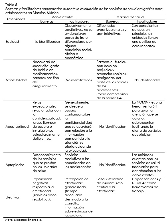 Entre las principales barreras de accesibilidad identificadas destacan las burocráticas y las culturales, estas últimas relacionadas con las actitudes y creencias por parte de los padres y madres de los adolescentes. El desconocimiento de la Norma Oficial Mexicana 047 identificado por el personal de salud, el desconocimiento de los diferentes servicios a los que pueden acceder en las unidades de atención por parte de los adolescentes y la ausencia de proyección y promoción comunitaria de los SSAA impactan en la percepción apropiada del servicio. Por último, la sistemática falta de insumos amenaza la efectividad de los servicios. En la tabla 5 resume las barreras y facilitadores percibidos para la oferta de SSAA con calidad.