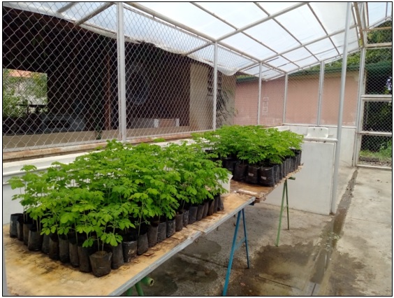 Para la instalación del ensayo fueron habilitadas 552 bolsas de vivero de 2 kg de capacidad. Los envases plásticos fueron colmados manualmente con sustrato preparado a base de suelo areno francoso (aF) y estiércol bovino, en una relación 7:3 (v/v), ambos materiales provenientes de la finca "La Campiña", ubicada en la parroquia San Simón, municipio Maturín. Previo al mezclado cada material de forma aislada fue secado bajo techo y pasado por tamiz de 5 mm.