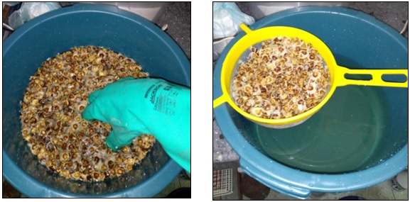 Se utilizó semilla de moringa procedente de la Tomatera de Caicara de Maturín, estado Monagas. La desinfección de las semillas se realizó con solución de hipoclorito de sodio. Para su preparación se empleó10 ml del cloro comercial Mas®, con 3,5% de hipoclorito de sodio y 990 ml de aguay triple enjuague en agua corriente(figura 2); adicionalmente se mantuvo la semilla en inmersión en agua corriente durante 24 h previo a la siembra. Posteriormente se sembraron dos semillas por bolsa a 2 cm de profundidad. De modo previo a la siembra el sustrato fue saturado con agua corriente y de allí en adelante se aplicó riego interdiario.
