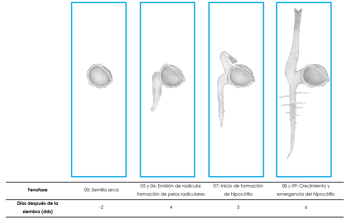 Fase 00:Semilla seca, hasta dos días antes de la siembra. Esta fase fue interrumpida por el manejo de la semilla, relacionado con la desinfección en agua clorada y la inmersión por 24 hen agua corriente,el día anterior a la siembra.
