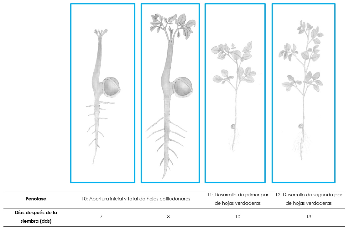 Fase 11:Desarrollo del primer par de hojas verdaderas, a los 10 dds. La plántula alcanza 12,16 cm ± 2,16 de altura y 2,57 mm ± 0,38 de diámetro basal. La LMHC es de 7,24 cm ± 1,02 y la longitud máxima del primer par de hojas verdaderas (LMPPHV) es de 2,98 cm ± 1,26. Morfológicamente se observa: yema apical formando segundo par de hojas; mayor rigidez del hipocótilo. Presencia de brotes basales a nivel de cuello, de color amarillo o verde intenso, poco desarrollado. Pelos radiculares abundantes y tan elongados como el eje central; la radícula toma ligera forma de zanahoria.La plántula presenta mayor longitud de la parte aérea respecto a la raíz.