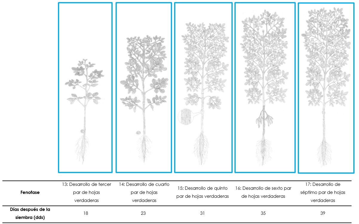 Durante estas fases la plántula aumenta el número de foliolos por hoja, con generación secuencial de tríos compuestos; además la plántula mantiene el engrosamiento progresivo de la raíz y sus ramificaciones (figuras 4 y 5).