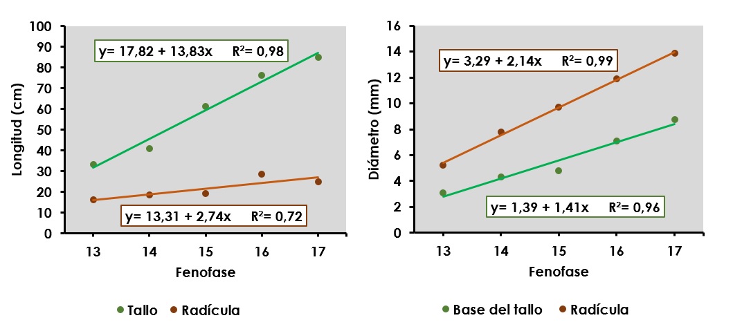 Los ajustes por regresión para las variables longitud y diámetro de tejidos aéreos ‒tallo y hojas‒y de la radícula, en función de las fenofases respectivas,fueron realizados mediante el programa INFOSTAT Versión 2020.