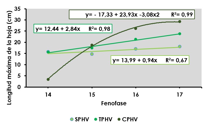 En cuanto al crecimiento en longitud de las hojas, se observó quelas hojas cotiledonares y el primer par de hojas verdaderas no presentaron variación significativa de la longitud durante las fenofases proyectadas, mientras que el segundo y tercer par de hojas mostraron ajuste de regresión lineal ascendente, con tasas de crecimiento de 0,945 y 2,845, respectivamente. El cuarto par de hojas presentó ajuste de regresión cuadrático y describe una curva convexa ascendenteque inicia con crecimiento acelerado (Fenofases 14 –16) y progresivamente tiende a estabilizarse (Fenofases 16-17) (figura 7).