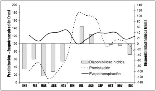 El conocimiento de las fenofases de esta especie durante la fase de vivero es de fundamental importancia, básicamente para establecer un plan de manejo del cultivo. Para las condiciones climáticas del estado Monagas, particularmente para el municipio Santa Bárbara, que representa una de las áreas con potencial para la cría y ceba del ganado vacuno y análogamente en ellas, podrían ser establecidos bancos de proteína con moringa. En la figura 8se puede visualizarel balance hídrico de la Estación Experimental Santa Bárbara del Instituto Nacional de Investigaciones Agrícolas (Sanabria et al., 2006).