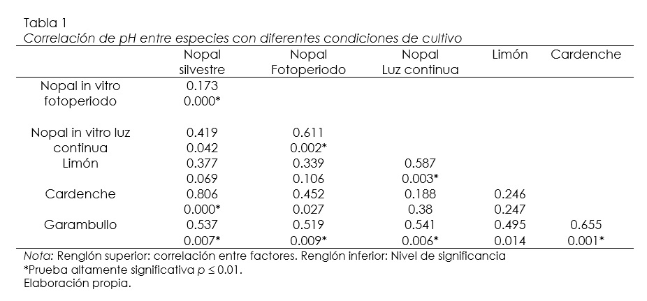 Se realizó un análisis estadístico para determinar la correlación entre las muestras evaluadas en cuanto a la variación del pH (prueba altamente significativa con un valor p menor a 0.01). Se obtuvo una correlación, entre las cactáceas cultivadas ex vitro, así como entre el nopal cultivado en fotoperiodo y ex vitro (tabla 1). Por su parte, nopal cultivado bajo luz no mostró correlación con los cultivados ex vitro y en fotoperiodo, pero sí con el limón (tabla 1).