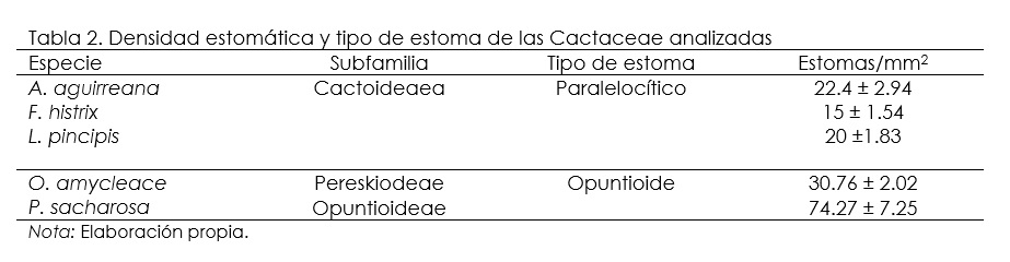 Tipos de estomas y densidad estomática. Se clasificó a los estomas de cinco cactáceas (figura 2) en dos tipos: paralelocítico y opuntioide (figura 3 y tabla 2). Los estomas tipo paralelocítico se caracterizan por presentar tres o más células acompañantes dispuestas en paralelo a las células guarda. Las especies de la subfamilia Cactoideaea (A. aguirreana, F. histrix y L. principis) mostraron estomas tipo paralelocítico (figuras 3A, 3B y 3C). Los estomas tipo opuntioide tienen varias células acompañantes, situadas en uno o dos círculos alrededor de las células guarda. Las especies de las subfamilias Pereskioideae (P. sacharosa) y Opuntioideae (O. amycleae) presentaron estomas tipo opuntioide (figura 3D y 3E). Esta disposición de los estomas en las subfamilias de cactus ya había sido observada previamente (Eggli, 1984;Herrera-Martínez et al., 2015). El acomodo de las células guarda y acompañantes puede ser útil para establecer la relación taxonómica entre las especies. En nuestra observación también encontramos una correlación entre la densidad estomática y el tipo de estomas, siendo las plantas con estomas tipo opuntioide las de mayor densidad(tabla 2). En plantas C3 y C4 que habitan en zonas áridas la densidad estomática está entre 100 300 estomas/mm2, mientras que en plantas MAC de 18 a 60 estomas/mm2(Hernández, Terrazas, Delgado, & Cavazos, 2007). La densidad estomática influye directamente no sólo en la capacidad de captación de CO2, sino en la pérdida de H2O. Aparte de la fotosíntesis CAM,la baja densidad estomáticaes una estrategia que le permite a las cactáceas tener una mejor EUA.