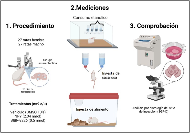 En un estudio previo informamos que el NPY produce efectos ansiolíticos e inhibe de manera prominente el consumo de alcohol en ratas Wistar, probablemente a través de los receptores NPY-Y1 en la SGP-D (Vázquez-León et al., 2020). El presente estudio se diseñó para analizar el efecto farmacológico de la estimulación/bloqueo de los receptores NPY-Y1 en la SGP-D de ratas Wistar macho y hembra sobre la conducta de ingesta de alimento, sacarosa y alcohol. Nuestra hipótesis de trabajo fue que el receptor NPY-Y1 de la SGP-D modularía de manera diferencial entre sexos biológicos a las conductas de ingestade alimento, sacarosa y alcohol.