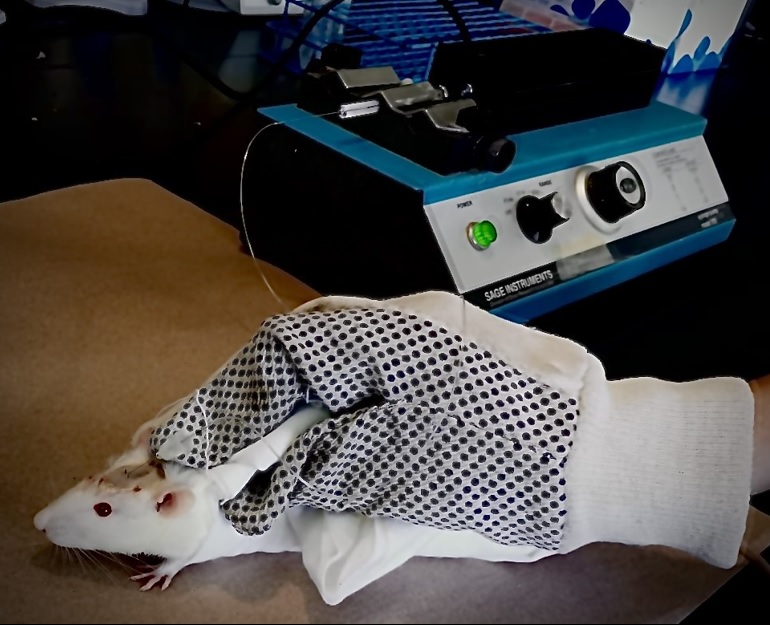 Luego del periodo de recuperación postquirúrgico (ver sección anterior)se administró el respectivo tratamiento farmacológico en la región SGP-D a través de un inyector conectado a una cánula (calibre 31 × 10 mm), que se extendía 1 mm más allá de la punta de la cánula guía. La cánula de inyección se conectó a una jeringa de 1 μL (Hamilton Co., Reno, NV, EE. UU.) con un tubo de polietileno 20 lleno de solución salina isotónica estéril (SSI). Las microinyecciones a través de la cánula se realizaron durante un período de 60 segundos y luego la cánula de inyección se dejó sin tocar durante 60 segundos para evitar el reflujo del fármaco. Mientras tanto, cualquier movimiento de lucha de la rata se restringió suavementemediante inmovilización (figura 2).