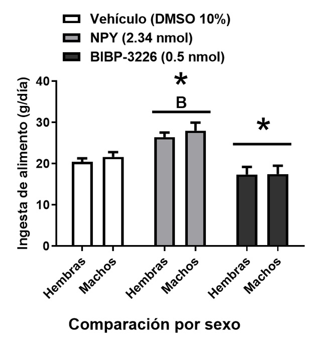En la figura 3se muestra el efecto de los tratamientos sobre la ingesta de alimento. Tanto en hembras como en machos el NPY aumentó la ingesta de alimento (p< 0.05) en comparación con el vehículo; mientras que los animales tratados con BIBP-3226 mostraron un menor consumo de alimento comparado con vehículo o NPY. Adicionalmente, cuando comparamos los efectos por sexo no encontramos diferencias (p> 0.05).