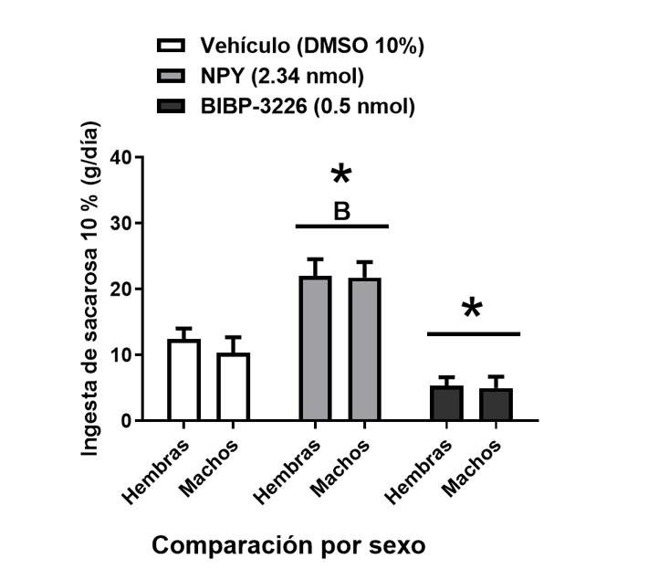 En la figura 4 se muestra el efecto de los tratamientos sobre la ingesta de sacarosa a 10%. Tanto en machos como en hembras los grupos que recibieron NPY (intra-SGP-D) consumieron mayor cantidad de sacarosa en comparación con el vehículo y con BIBP-3226 (p< 0.05).A su vez, los animales tratados con BIBP-3226 consumieron menor cantidad de sacarosa en comparación con el vehículo (p< 0.05). No existió interacción entre tratamientos y sexo biológico (p> 0.05).