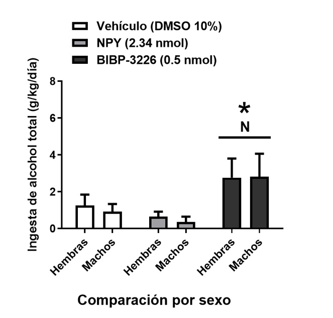 En la figura 5 se muestra el efecto de los tratamientos sobre el consumo total de alcohol. Los animales que recibieron BIBP-3226 (0.05 nmol) intra-SGP-D consumieron una mayor cantidad de alcohol con respecto al vehículo y a los que recibieron NPY (p<0.05), sin interacción entre tratamientos y sexo biológico (p> 0.05).