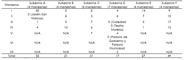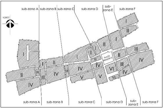 En la zona del Centro Histórico de Aguascalientes identificamos 28 manzanas divididas en las6 subzonas. La subzona A: 4 manzanas; subzona B: 4 manzanas; subzona C: 5 manzanas; subzona D: 7 manzanas; subzona E: 4 manzanas y subzona F: 4 manzanas. Ver figura 5.