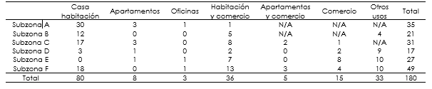 Nota:Elaboración propia.-El uso de los inmuebles es predominantemente de Casa-habitación, ya que en la zona de estudio encontramos 80 de un total de 180 inmuebles, lo que representa44.44%. La subzona A es la que cuenta con mayor número de fincas con uso de Casa-habitación. Hay 8 con uso de Apartamentos, 36 de Habitaciones y comercio, 5 de Apartamentos y comercio y 5 en la categoría de Otros, con habitación y otro uso. De lo anterior -80+54 inmuebles-podemos observar que 74.44% es de uso habitacional. De los 180 inmuebles, 14 tienen uso de Oficinas -7.77%-,lo que nos dice que este uso en el Centro Histórico va desapareciendo para trasladarse a la periferia. De los 180 inmuebles solamente 16 -8.88%-es ciento por ciento Comercio y 39 fincas -21.66%-comparten el uso; por ejemplo, Oficinas y comercio, Apartamentos y comercio y Habitación y comercio, entre otros, particularmente los edificios sonde varios niveles y el comercio se encuentra en planta baja. El restante de los inmuebles tiene usos diversos, tales como los servicios, teléfonos, estacionamiento y los servicios profesionales como consultorios.Ver tabla 2