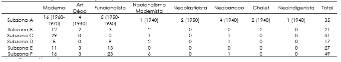 En los recorridos de las calles encontramos estilos o codificaciones expresivo-formales: Ecléctico de transición -Art Déco, Neo-Colonial, Neo-Barroco o Colonial Californiano, Neo-Indigenismo, Nacionalismo Modernista y Chalet-y Racionalistas –Neoplasticismo-. Ver tabla 3