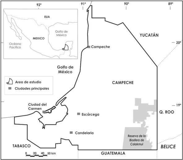 El área de estudio es el estado de Campeche (figura 1) y se encuentra entre las coordenadas geográficas extremas 20° 50' y 17° 48' Norte, y 89° 07' y 92° 28' Oeste. Su ubicación zonal planetaria y la azonalidad condicionada por la poca energía del relieve determinan climas cálidos subhúmedos, con lluvias abundantes en verano y temperaturas medias alrededor de 26 °C. La precipitación total anual varía entre 1,200 y 2,000 mm y la vegetación corresponde a comunidades de selvas tropicales bajas y medianas subcaducifolias, subperennifolias e inundables.