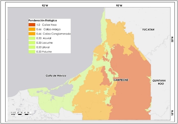 El modelo de susceptibilidad se expresa en tres mapas; dos parciales de ponderación litológica y de ponderación morfoestructural y un mapa final o resultado de susceptibilidad a la subsidencia y colapsos kársticos. Los insumos cartográficos y los mapas se desarrollan en escalas medias 1:250,000 acordes a niveles regionales. El mapa de ponderación litológica sintetiza la solubilidad intrínseca de las rocas, impurezas y tamaño de las partículas por tipos litológicos. Las características de las rocas se delimitaron a partir de las unidades geológicas cartografiadas por el Servicio Geológico Mexicano (SGM, 2006) en formato vectorial. A partir de éstas se realizó en campo un muestreo estratificado aleatorio de 42 muestras representativas que fueron analizadas en su composición general por difracción de rayos X en el Instituto de Geología de la UNAM en 2009. Confirmando la información del SGM, a cada tipo litológico se le asignó una ponderación numérica entre 0 y 1 según el criterio de solubilidad diferencial en tres niveles: bajo (0.33) medio (0.66) y alto (1.0).