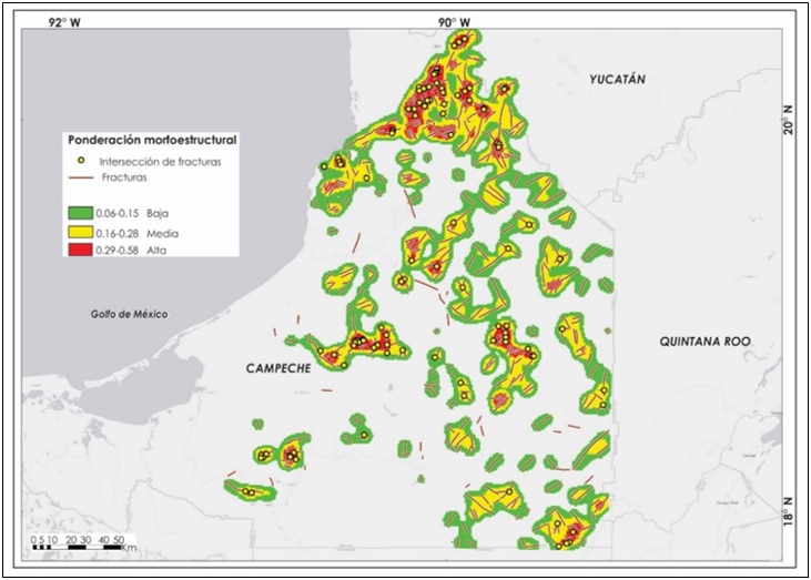 Derivado del análisis de los datos disponibles se generó el mapa de ponderación morfoestructural, que muestra la concentración por zonas, de rupturas litológicas (diaclasas, fallas y puntos de intersección) que incrementan proporcionalmente la susceptibilidad al intemperismo fisicoquímico y los procesos corrosivo-erosivos (figura 3). La variable condicionante de disolución asociada al espesor de los estratos presenta espesores potentes y muy potentes para todo el estado de Campeche; por lo que aunque no contribuye a la delimitación diferencial de la susceptibilidad, sí a la ponderación global.