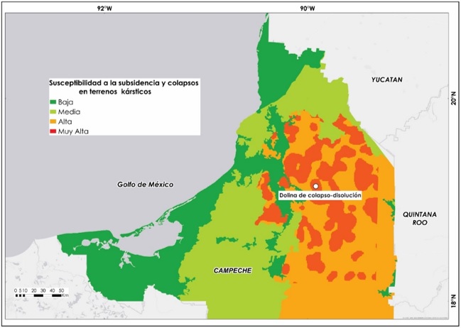 En Campeche los patrones de susceptibilidad a la subsidencia y los colapsos por disolución resultaron ser heterogéneos en función de las condiciones ambientales, estructurales y de la naturaleza litológica específica de los paisajes kársticos. Destacan sobre todo zonas de cobertura restringida donde alternan calizas con yesos, esmectitas y altas densidades de fracturas e intersecciones.