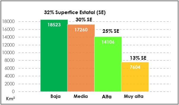 Se calcularon las áreas y porcentajes correspondientes a los niveles de susceptibilidad de la subsidencia y los colapsos a nivel estatal, en donde se obtuvieron las cifras que se muestran en la figura 5.