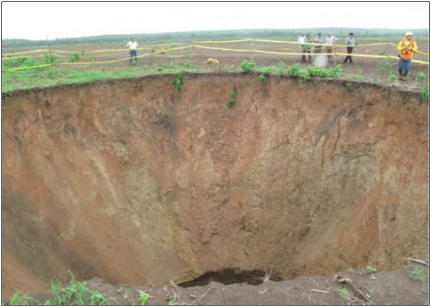 La certeza de subsidencia y colapsos en Campeche son difíciles de monitorear debido al predominio de karst cubierto o estabilizado por selvas tropicales primarias y secundarias; no obstante, se pudo comprobar la utilidad de la presente propuesta al detectar recientemente una dolina de colapso-disolución con forma cónica inversa y fragmentos de brecha en su fondo. En la figura 6 se muestra la dolina de colapso-disolución que se originó en julio de 2010 en el municipio de Hopelchén (19° 09´ 2´´ Norte y 89° 55´ 19´´ Oeste, ubicada en figura 4). Corresponde con zonas de susceptibilidad muy alta con alta densidad de fracturas y litología altamente susceptible a la disolución. La poca movilidad superficial del agua en los bajos inundables implica mayores tiempos de contacto entre el agua y las rocas, propiciando mayores niveles de disolución en rocas subyacentes. En los depósitos intermedios se encontraron esmectitas, que son arcillas que incluyen la montmorillonita, con un coeficiente de expansión lineal de > 0.9 muy alto que corresponde con una alta propiedad expansiva por humedad, y un índice de plasticidad de > 15 que son suelos sin cohesión con baja plasticidad. En el fondo se encontraron depósitos brechosos a 23 m de profundidad.