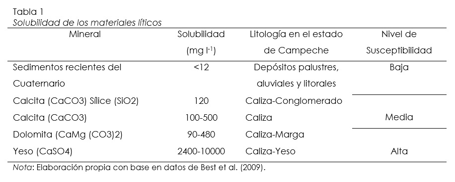 Entre los resultados del componente litológico destaca el diferente comportamiento disolutivo entre yesos, sales y carbonatos. La extraordinaria diferencia de las solubilidades respectivas oscila entre cientos de g l-1 para la sal, en torno a 2 g l-1 el yeso frente a algunos centenares de mg l-1 de las calizas y las dolomías. Las calizas interestratificadas con yesos muestran en el estado de Campeche la más alta susceptibilidad a la disolución y, en menor grado, calizas con margas, calizas con conglomerados y depósitos palustres, aluviales y litorales. Para hacer comparables las solubilidades de los minerales que existen en Campeche se tomaron estándares teóricos promedio a 25 °C, presión de 1 atm y en agua con pH7 con base en el trabajo de Best, Fielding, Jarvis y Mozley (2009). Sus solubilidades promedio y su relación con los niveles de susceptibilidad esperada se presentan en la tabla 1.