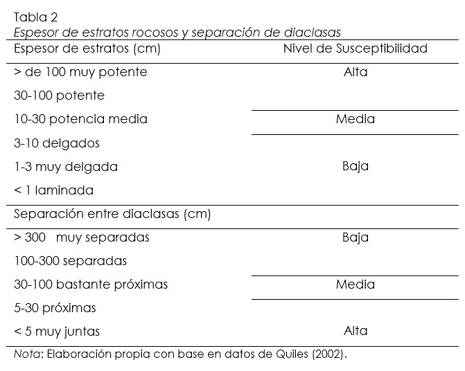 Los rasgos micro y macromorfológicos asociados a las áreas de rupturas litológicas que favorecen la disolución en la zona de estudio se encuentran con separaciones entre diaclasas de 30 a 100 cm bastante próximas y espesores masivos en los estratos (Quiles, 2002, pp. 115-224). Esto puede consultarse en la tabla 2.